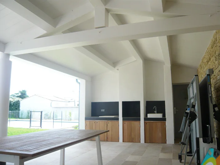 L’habitation se distingue par ses belles hauteurs sous plafond, réalisées en cintrés et rampants, accentuant le volume et la luminosité des pièces. Le projet s’organise en deux espaces distincts reliés par un salon d’été :