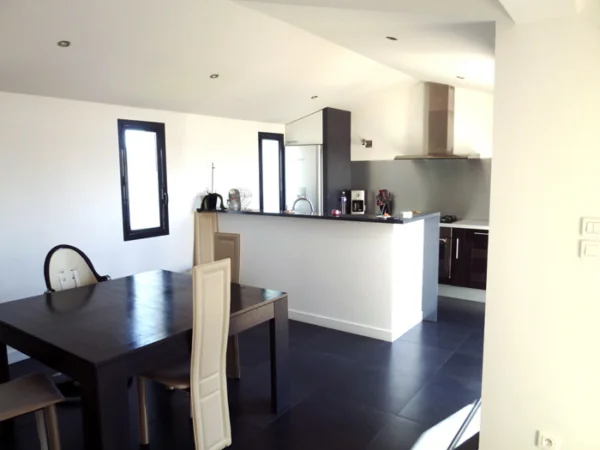 L’intérieur reflète cette volonté d’allier esthétisme et confort. Le plan a été conçu pour faciliter la circulation et optimiser chaque espace : un vaste séjour avec coin repas, une cuisine fonctionnelle, un cellier, trois chambres, une salle de bains, deux WC et une suite parentale avec dressing et salle d’eau privative. Un garage attenant complète l’ensemble, renforçant la praticité du logement.
